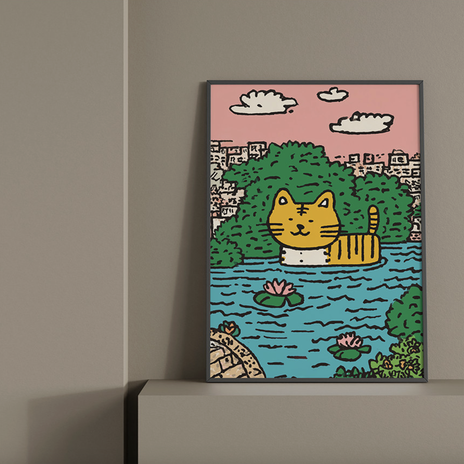분홍빛 하늘 아래, 청록색 물결이 잔잔한 연못. 연못 위로 초록 숲이 둥글게 둘러져 있고, 그 한가운데 노란 고양이가 둥둥 떠 있어요. 연못에는 연꽃이 살짝 올라와 있고, 뒤쪽으로는 동네 건물들이 흐릿하게 보이는 풍경.