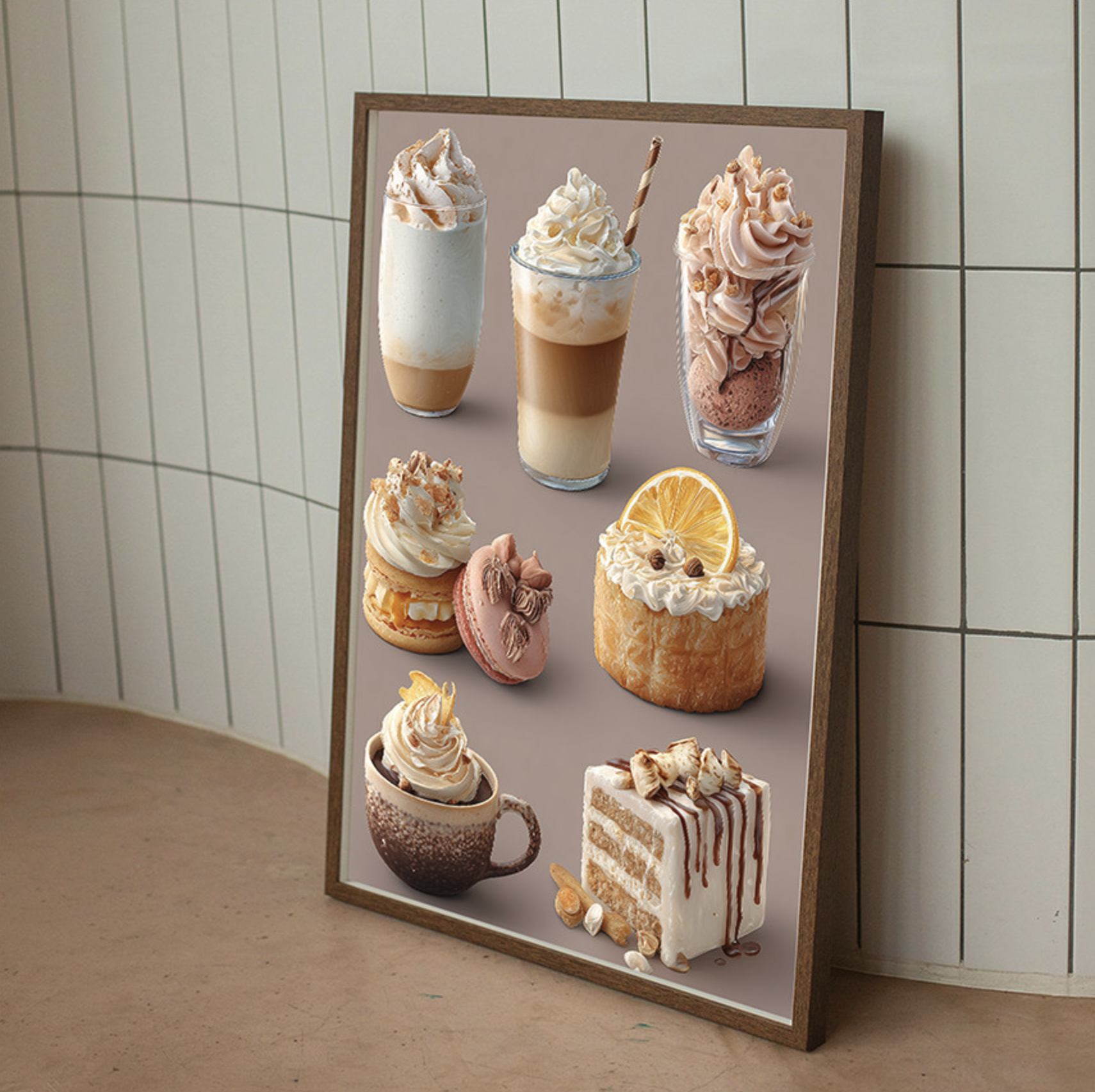 케이크 한 조각, 크림 음료, 작은 디저트들이 각각의 자리에서 딱 정리되어 있어요. 그래서 벽에 걸었을 때 복잡하지 않고, 보는 재미가 있어요. “이건 오늘 먹고 싶은데?” 하면서 은근히 기분이 좋아지는 스타일.