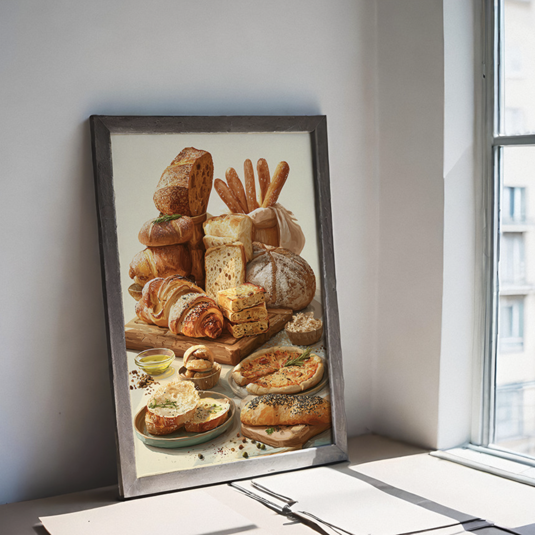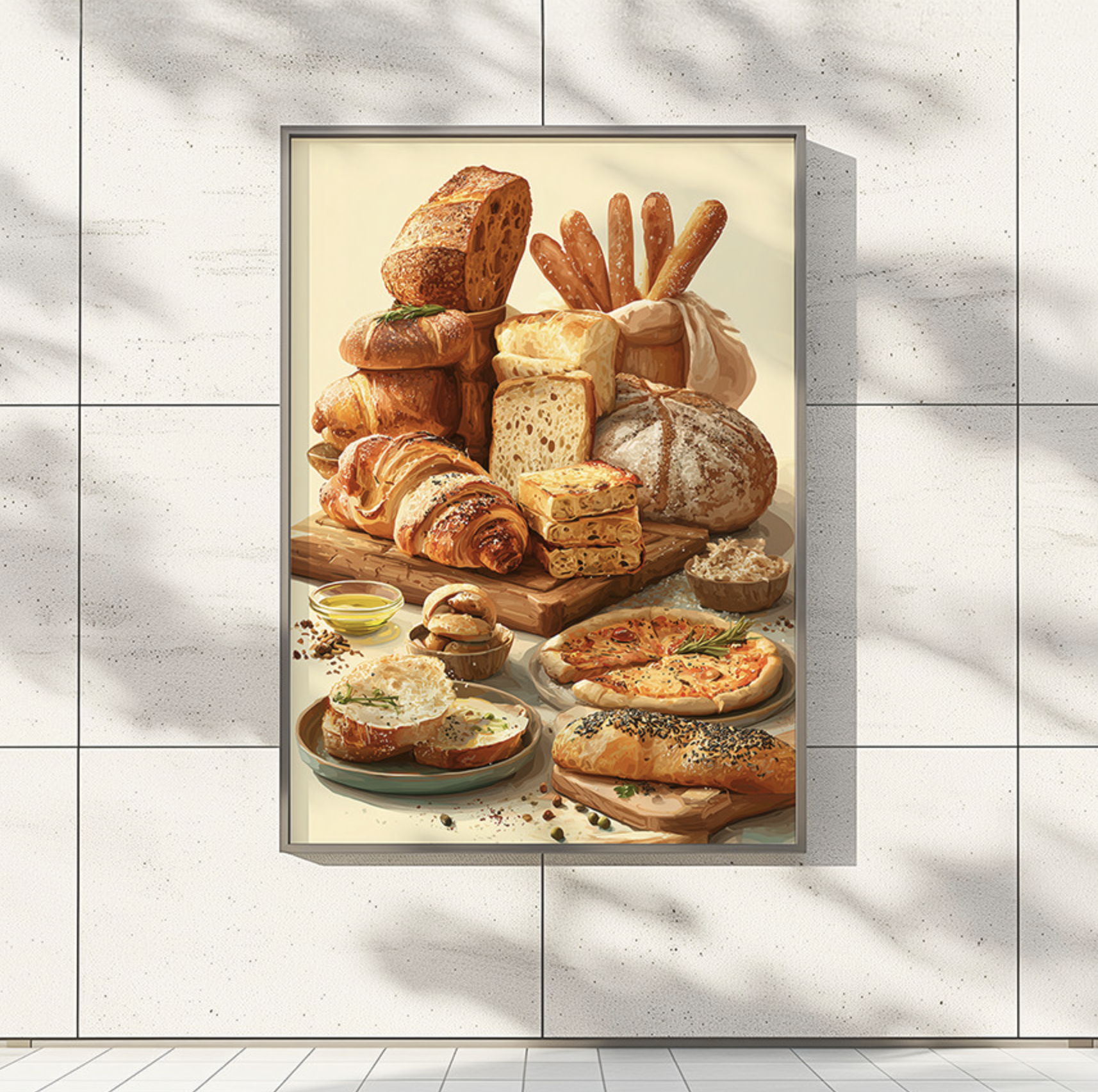 바게트 한 조각, 올리브오일, 치즈가 얹힌 빵, 그리고 따뜻하게 구운 크루아상… 이런 것들은 카페 메뉴보다도 ‘집 밥’ 같은 정서랑 맞닿아 있잖아요. 그래서 거실 인테리어 포스터로도 괜찮지만, 특히 다이닝 공간이나 주방 벽에 걸면 더 자연스러워요.
