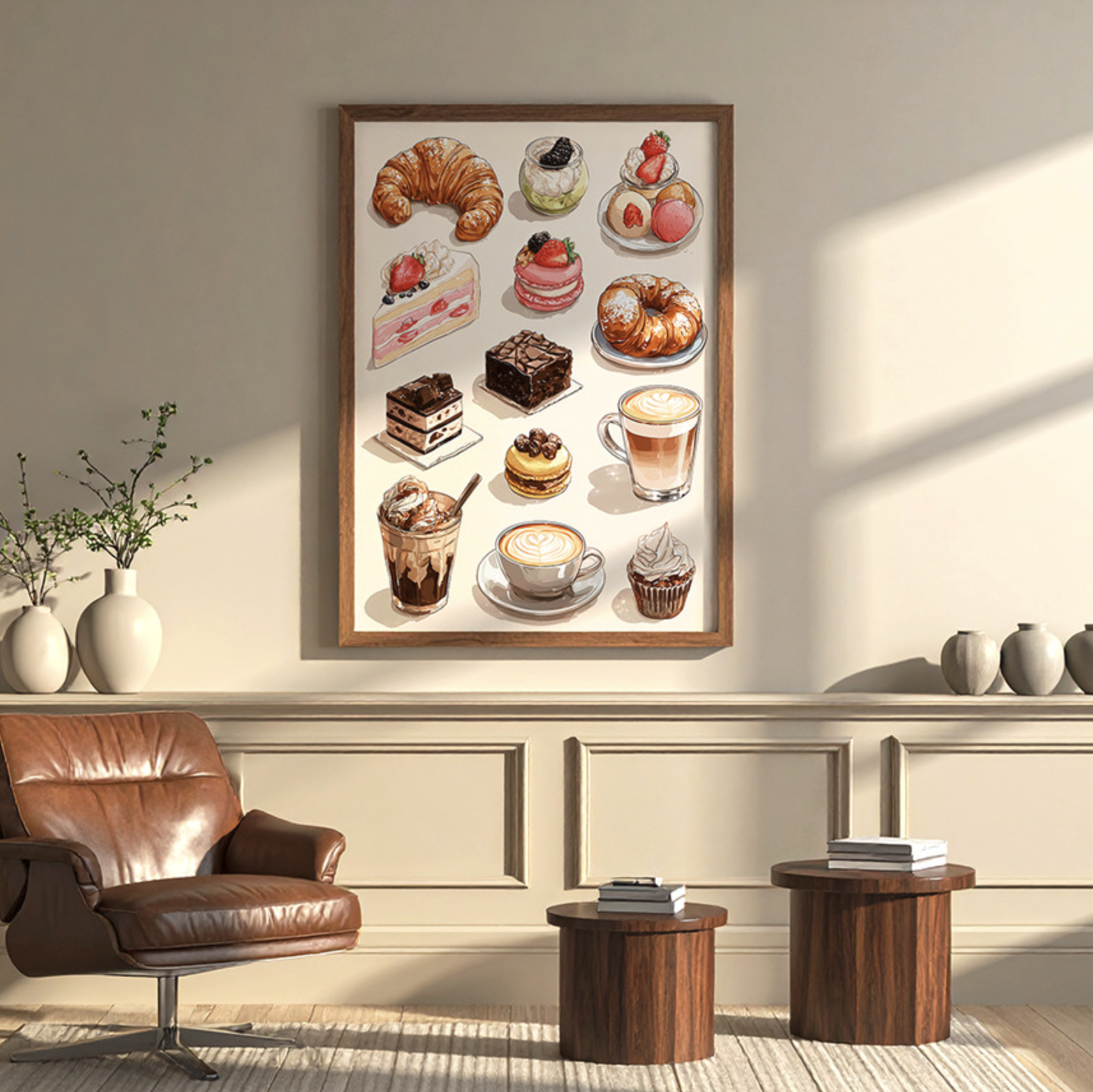 이건 정말 설명이 어려운데요. 디저트 그림은 보기만 해도 기분이 살짝 좋아지는 힘이 있는 것 같아요. 커피 한 잔 내릴 때, 식탁에 앉아 있을 때, 설거지하다가 잠깐 고개 들었을 때… 그 순간에 벽이 따뜻해 보이면 생활이 조금 편해져요.