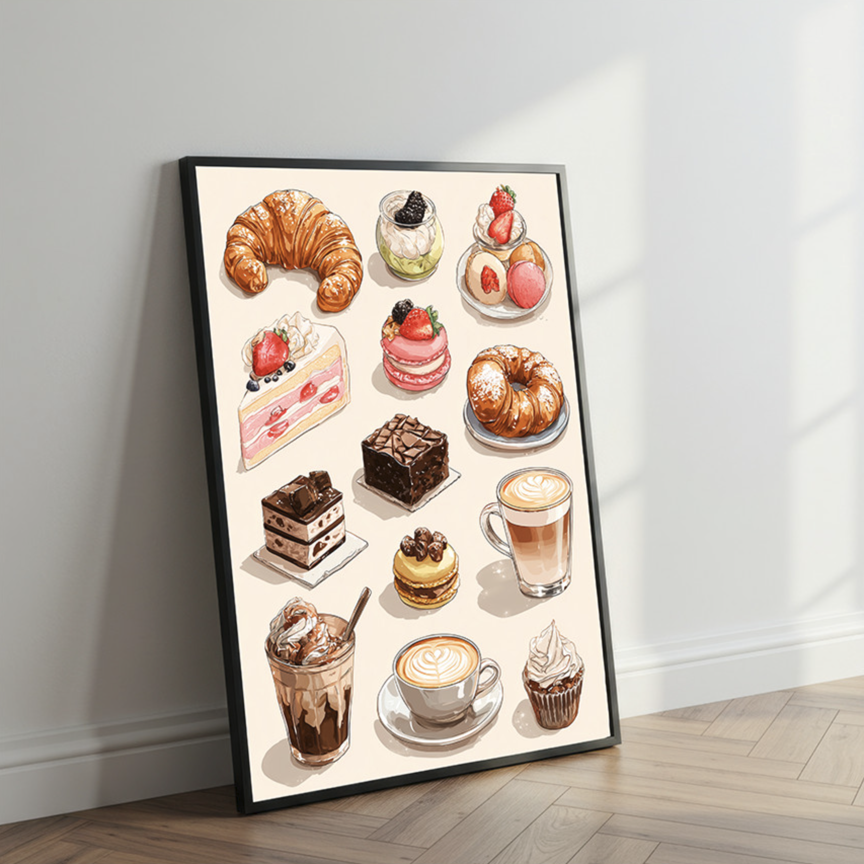 오늘 소개할 포스터가 딱 그런 쪽이에요. 디저트와 커피가 한 화면에 모여 있는데, 하나의 큰 장면이라기보다는 “카페 메뉴를 정갈하게 모아둔” 드로잉 느낌이 강해요. 크루아상, 딸기 케이크, 초콜릿 케이크, 마카롱, 컵케이크, 라떼, 아이스 초코 같은 것들이 각각 따로 배치되어 있어서, 벽에 걸어두면 보는 재미가 있어요. 그리고 색이 과하지 않고 톤이 차분해서 주방 인테리어 액자로도 부담이 적고, 거실 한쪽 벽꾸미기로도 자연스럽게 스며드는 타입입니다.